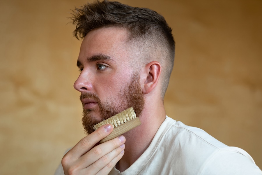 After detangling with a comb, a boar bristle brush can help train the beard to grow and lie in a consistent direction.